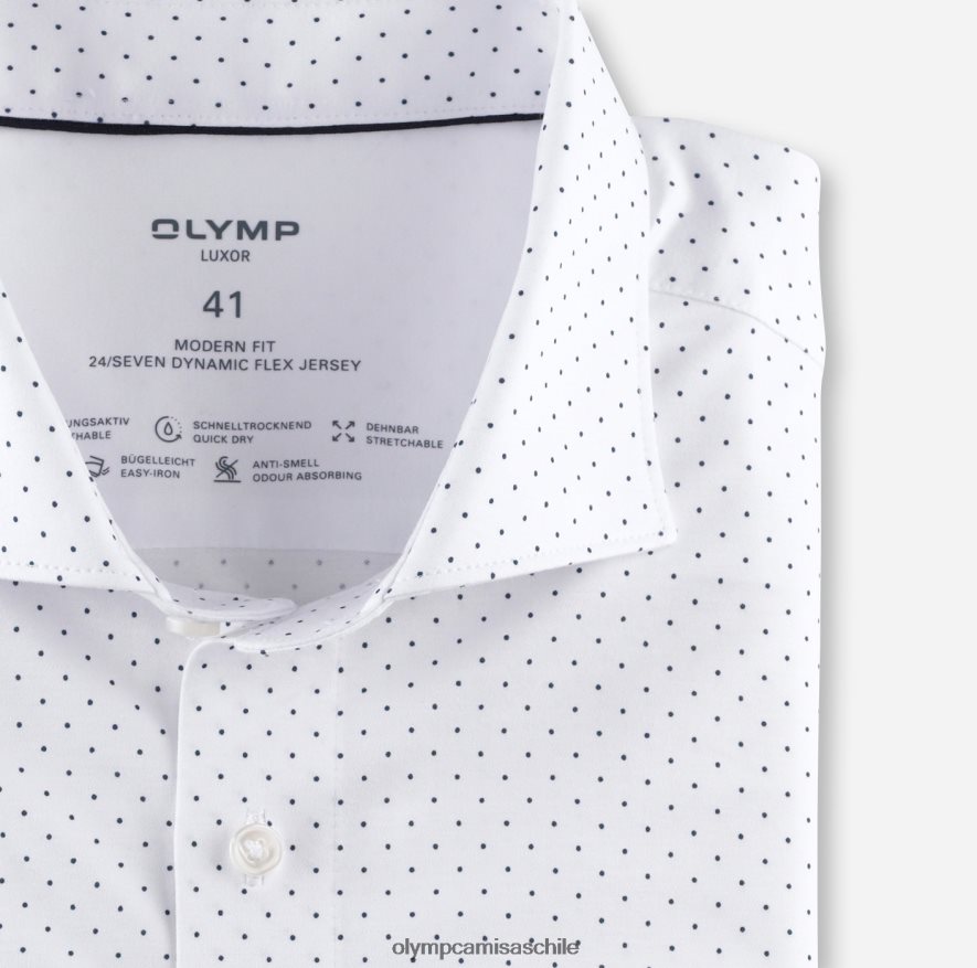 Estilo y comodidad: la silueta ligeramente entallada y perfectamente ajustada se presenta como una simbiosis elocuente de la tradicional calidad de la confección masculina y la indiferencia a la moda. Esta camisa Olymp Luxor Modern Fit 24/7 Dynamic Flex con distintivo cuello Kent y diseño clásico de lunares en azul marino sobre blanco impresiona en el segmento empresarial por su máxima libertad de movimiento, retención dinámica de la forma y estética clara. la camiseta es transpirable, de secado rápido, elástica, fácil de planchar y antiolores. sin bolsillo en el pecho.