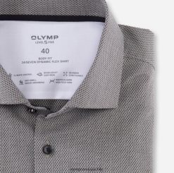 un toque elegante gracias al patrón de tejido finamente estructurado en color oliva: la camiseta de punto Olymp Level Five impresiona por sus líneas que realzan la figura y los atributos funcionales del tejido Dynamic-Flex con función de control climático. es transpirable, elástico, de secado rápido y regula la temperatura y la humedad. acabado con un cuello Kent clásico y acentuado con detalles de moda dentro del cuello.