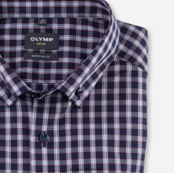 Los cuadros agradables impresionan por sus armoniosos colores y su inusual disposición de los campos. Esta camisa de manga corta entallada de Olymp Luxor Modern Fit con un patrón de alto contraste y detalles en rojo se puede combinar infinitamente: informalmente con jeans o chinos, o deportiva, pero elegante, con una chaqueta. El cuello deportivo con botones subraya su carácter dinámico de jugador de equipo y deja a usted la cuestión de elegir una corbata olímpica a juego. El tejido de fibras de algodón puro, de fácil cuidado y fácil planchado, ahorra tiempo y facilita el manejo, además de lucir una figura perfecta cuando se viaja: lavar, secar, usar es el lema de Olymp Luxor.